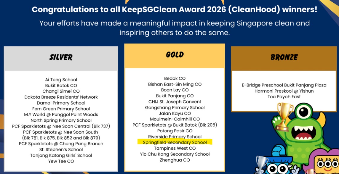 Springfield Secondary School is proud to be a recipient of the KeepSGClean Award 2026 (CleanHood), achieving the Gold Tier in our very first submission. This national recognition reflects the collective effort of our students and staff in keeping our school environment clean, green, and welcoming for all. Guided by the values of shared responsibility and graciousness championed by the Keep Singapore Clean Movement, our school community continues to play an active role in caring for our environment.