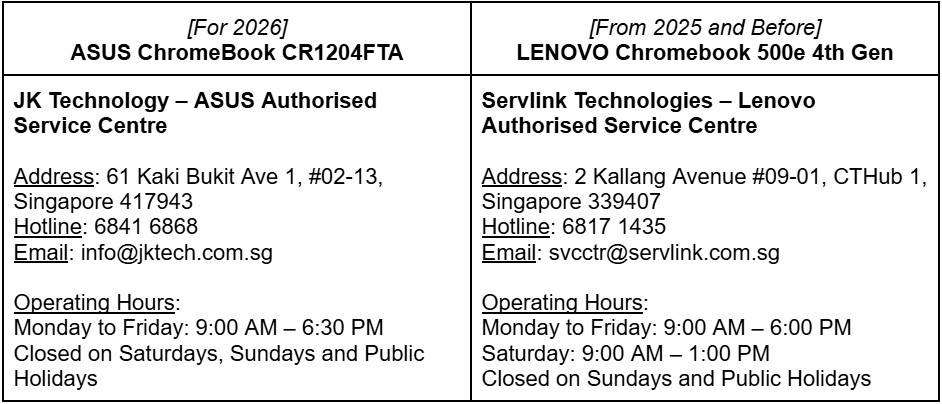 (For students using the ASUS Chromebook, JK Technology provides only on-site collection services. The ICT Team will advise if this arrangement is possible, on a case-by-case basis.) -